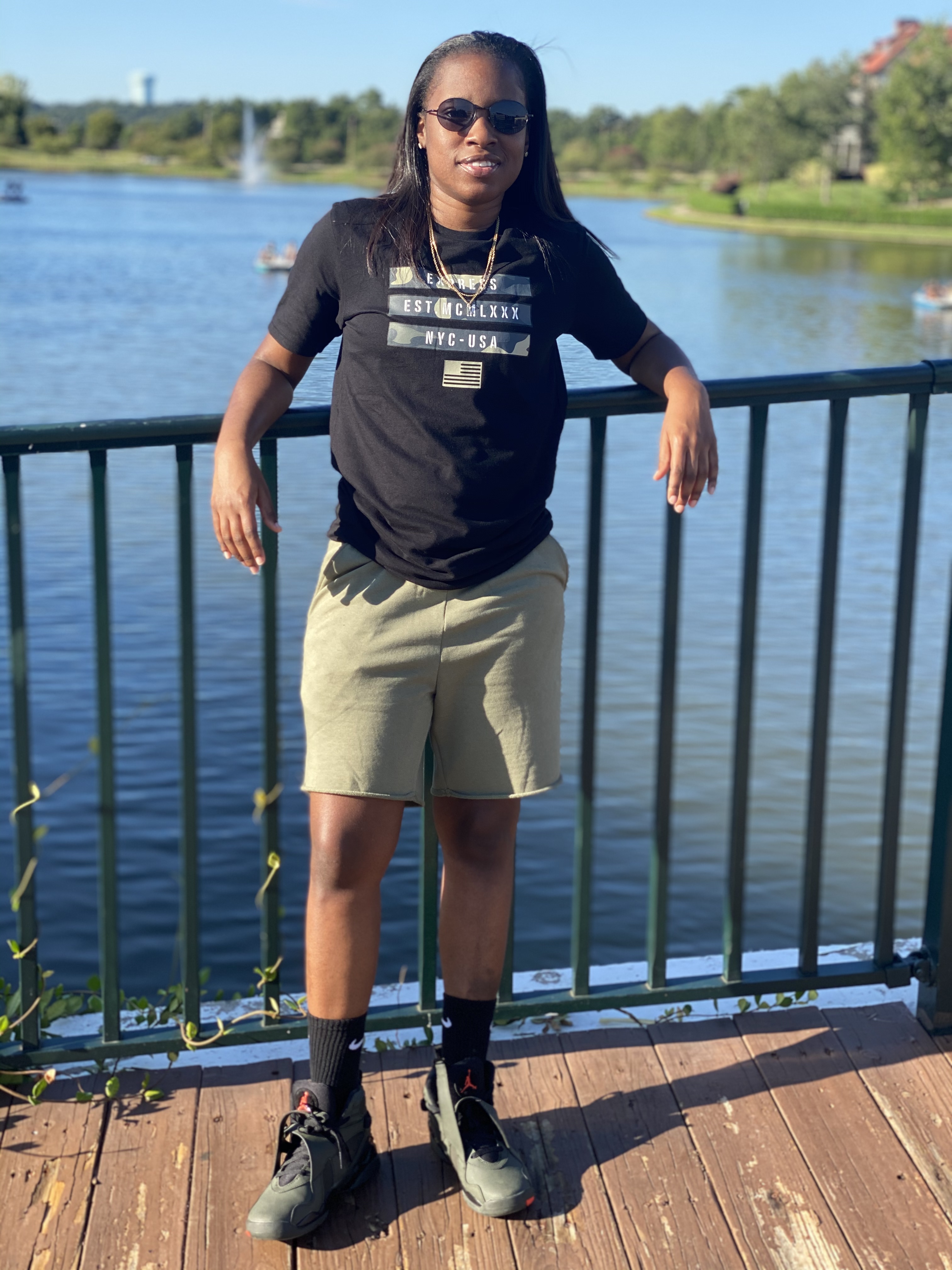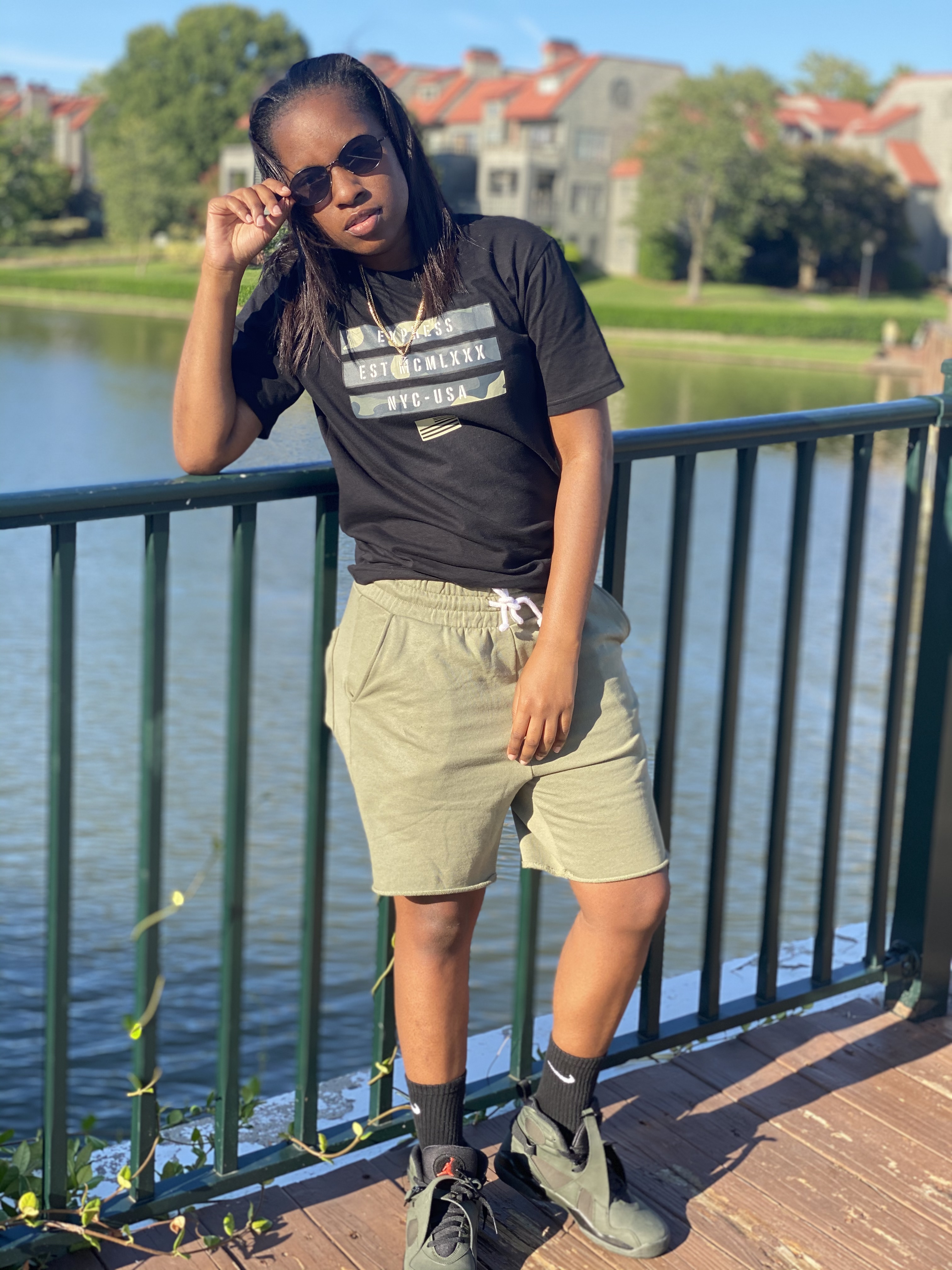 In this look, I am wearing an Express t-shirt, H&M Olive green sweat shorts, Nike Black socks, and Jordan Retro 8 ‘Take Flight’ Sequoias.