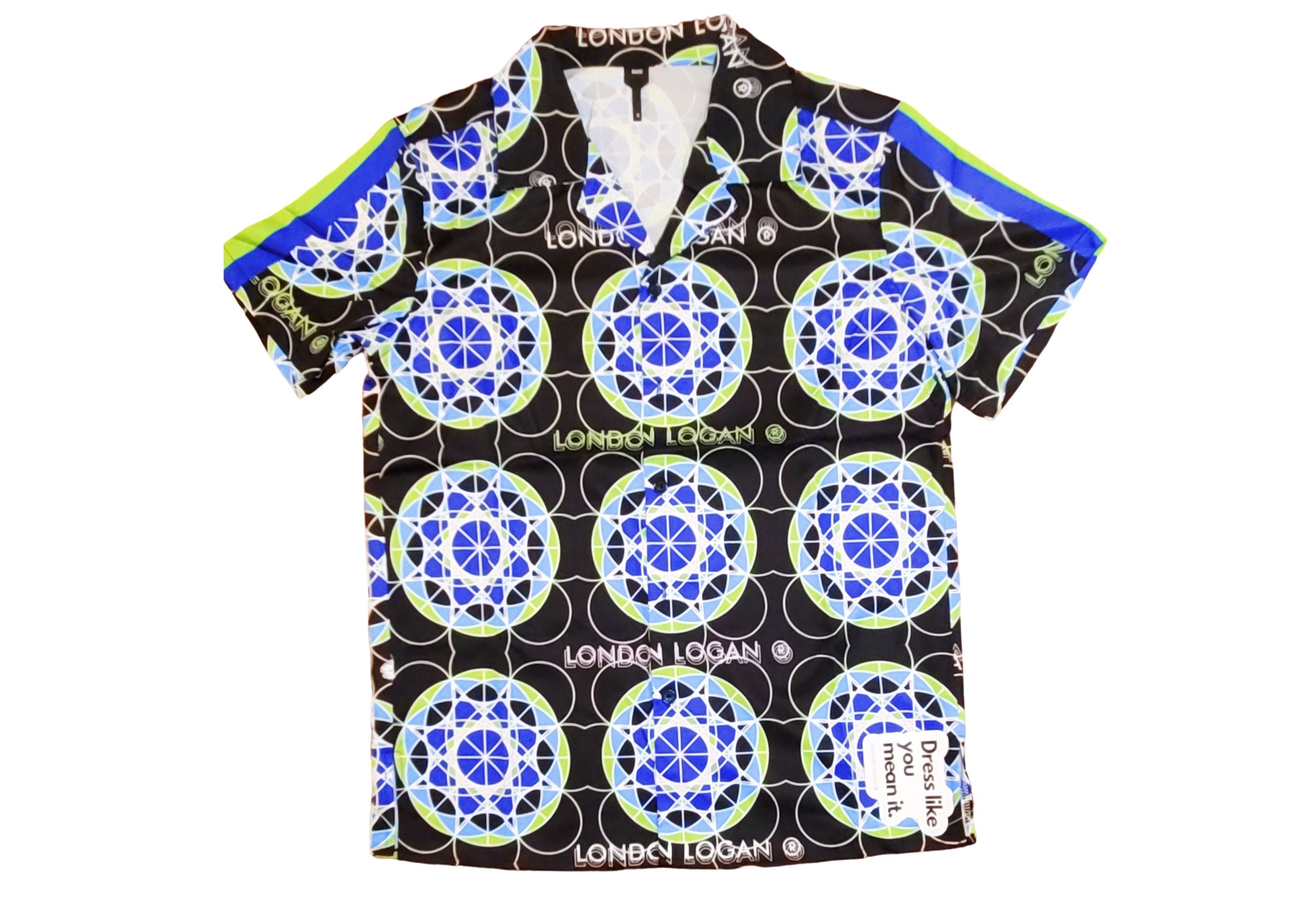 3. Black mosaic design shirt that features black, royal blue, lime green, and hints of white with small traces of pink white. It was a design I created because the colors were stuck in my head.